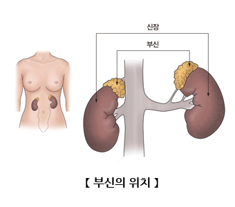 부신은 좌우에 길이 4~5cm, 높이 2~3cm, 무게 7~8g의 작은 기관이며, 우측은 삼각형, 좌측은 반달형의 모양을 이루고 있습니다.