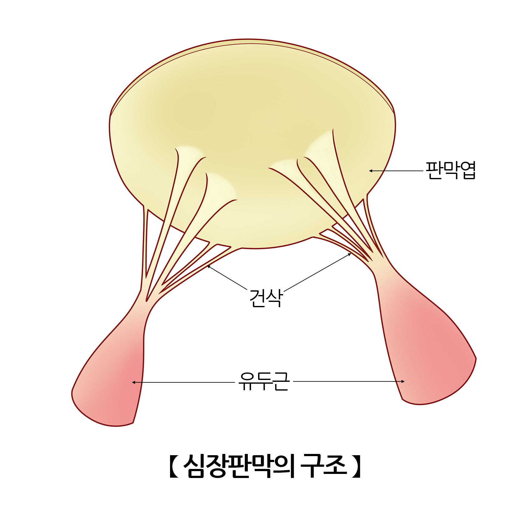 유두근이 판막엽과 연결되어 판막엽이 움직일 수 있도록 합니다. 유두근과 판막엽 사이에 건삭이 있어 판막이 좌심방으로 밀리지 않고 제 위치를 유지할 수 있도록 합니다. 특히 승모판은 삼천판과 비슷한 구조이나 좌심실의 높은 압력에도 견딜 수 있도록 두껍고 강한 편입니다.