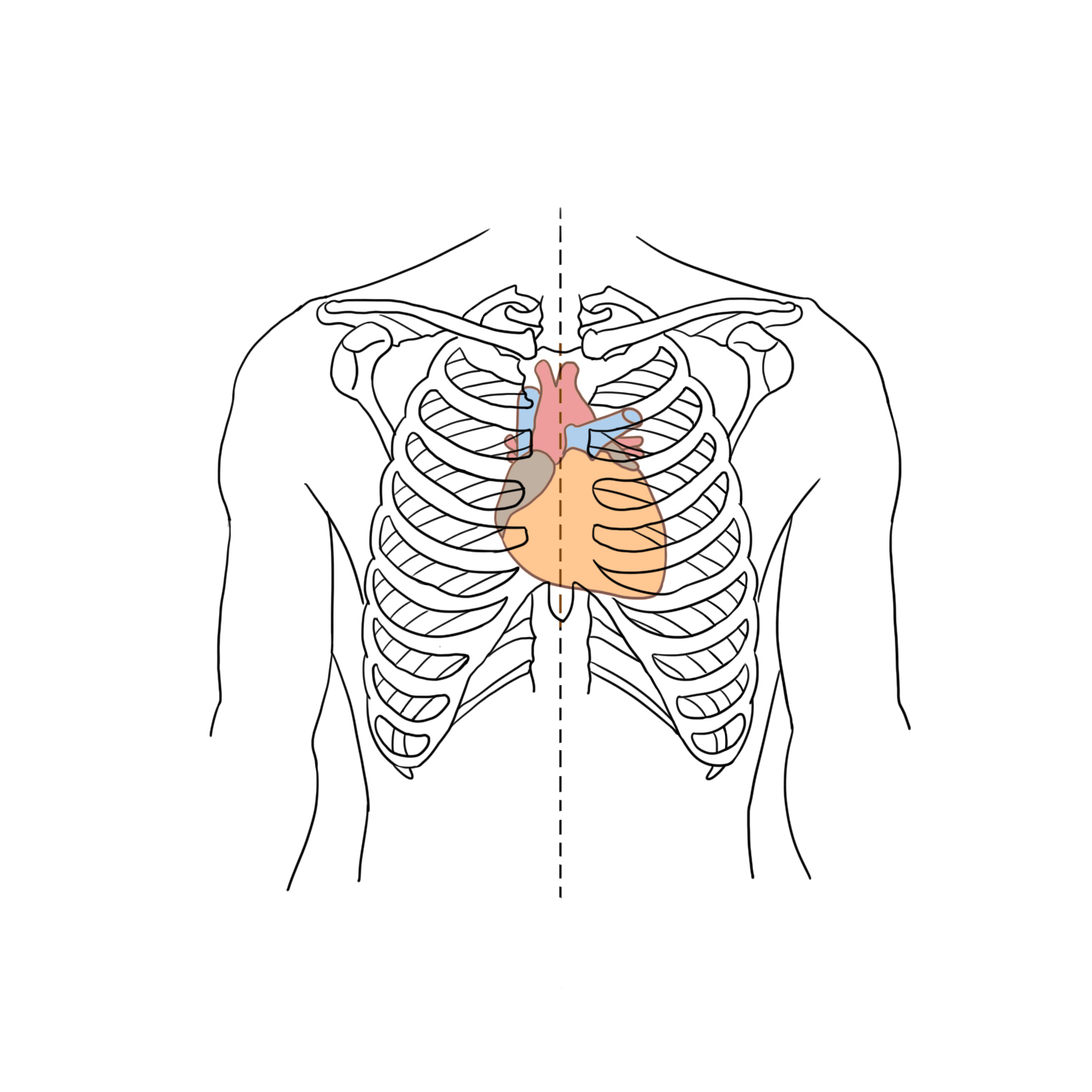 가슴의 왼쪽에 위치하며 흉골을 기준으로 왼쪽으로 2/3, 오른쪽으로 1/3이 위치하게 됩니다.